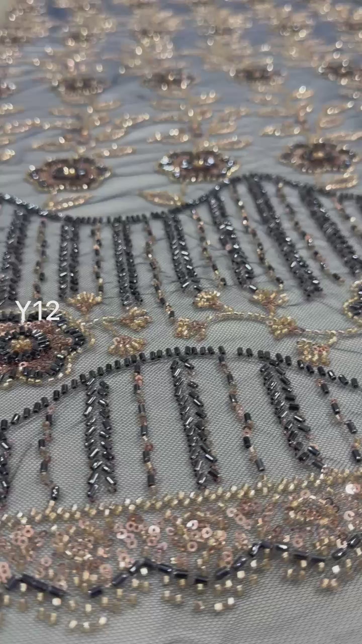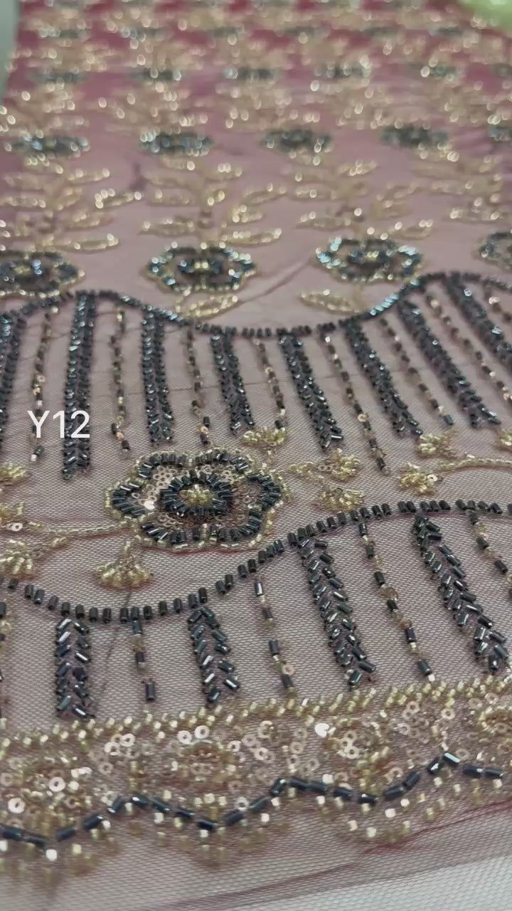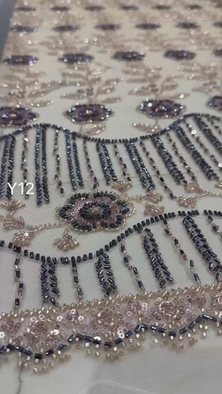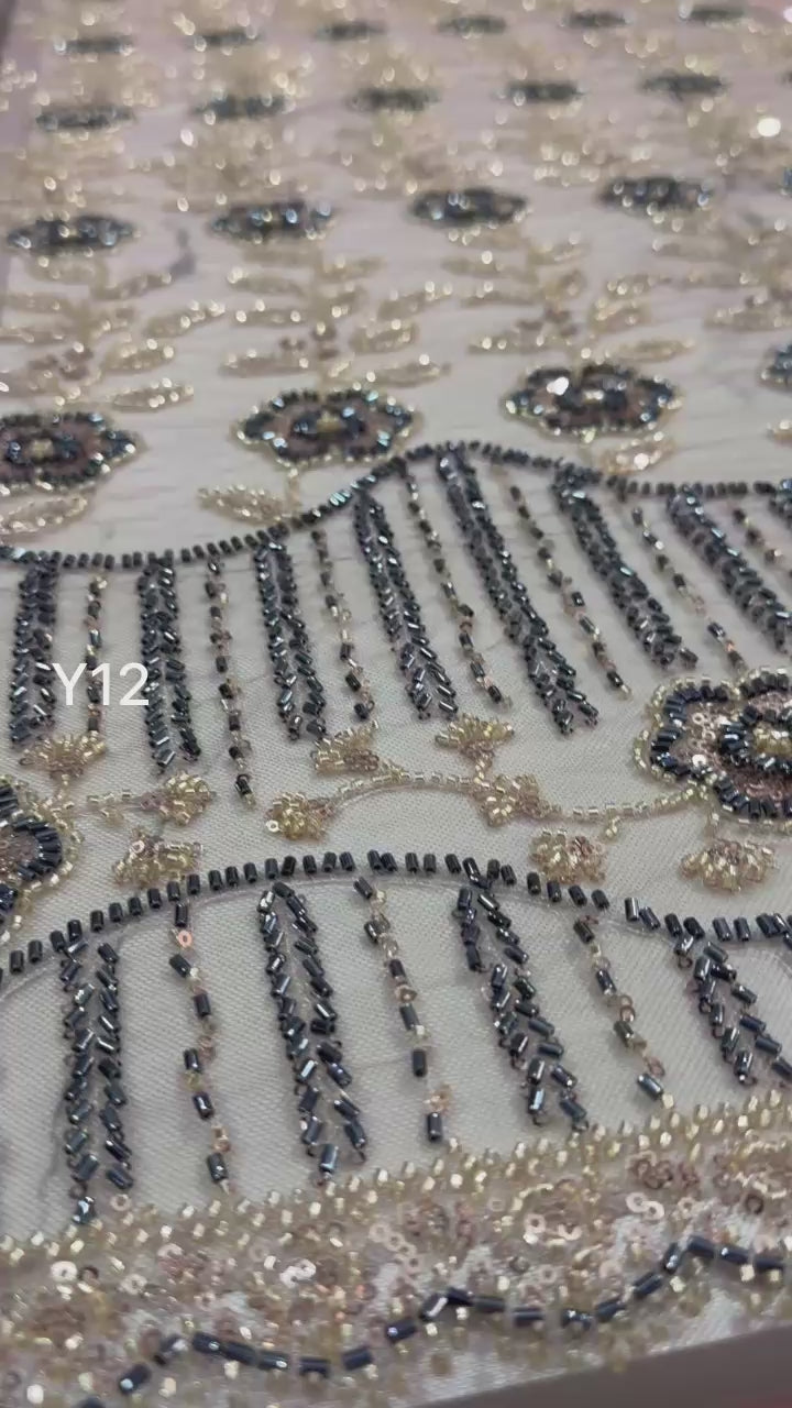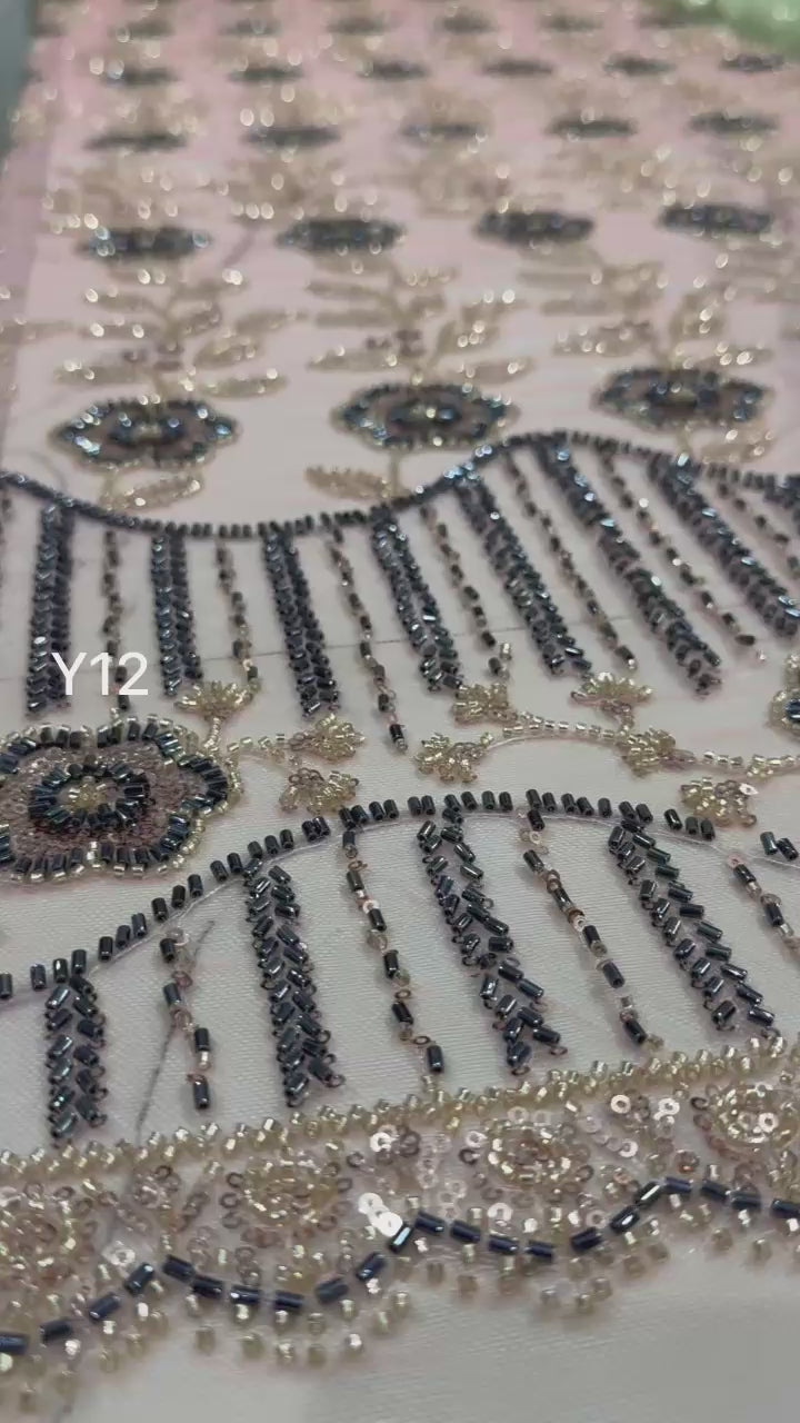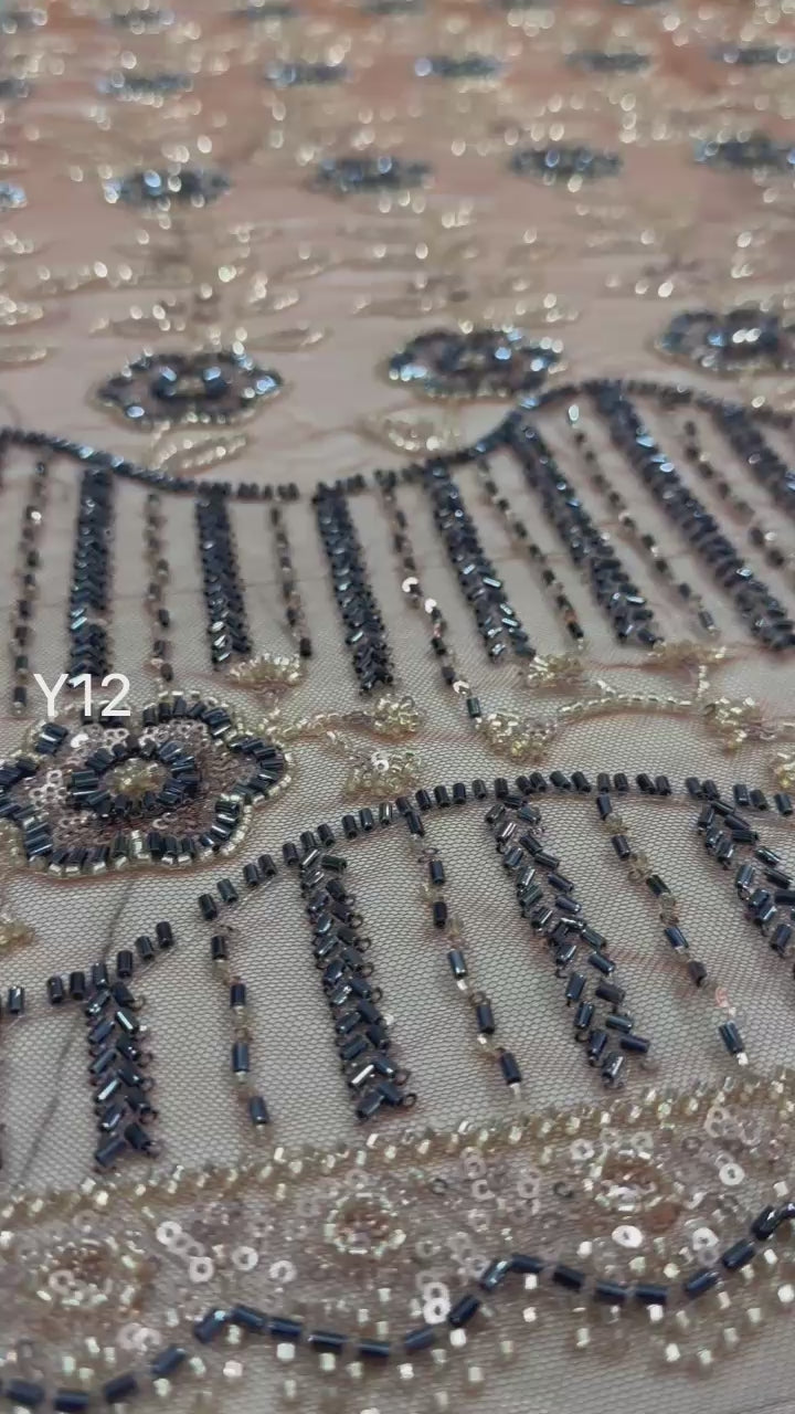 - Matière : Tissu de base (tulle) brodé de perles cousues main et machine